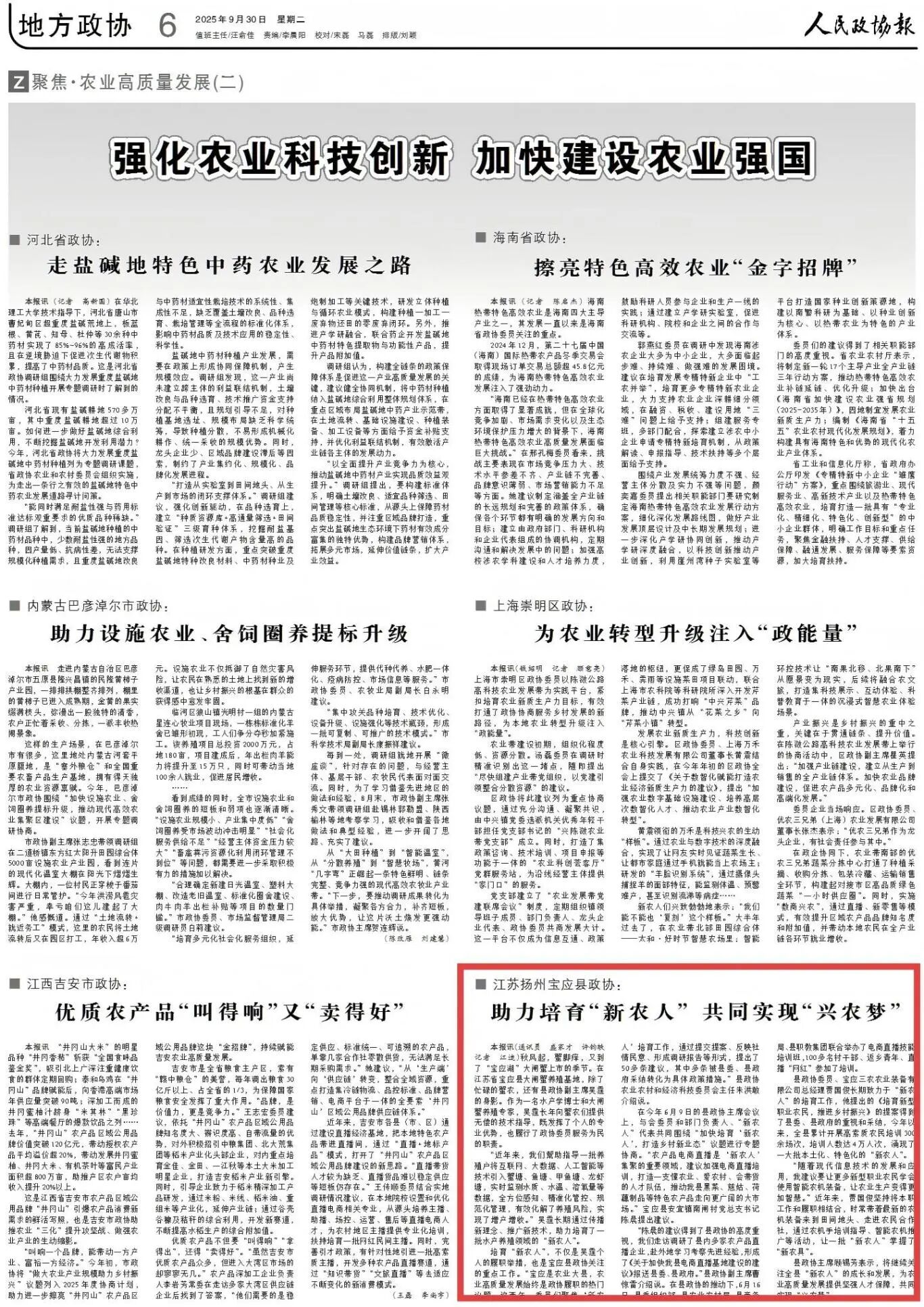 9月30日,《人民政协报》“地方政协”栏目围绕“强化农业科技创新 加快建设农业强国”主题,对地方政协履职成效进行了专题报道,其中,重点关注县政协助力培育“新农人”履职成效。现将全文转载如下: