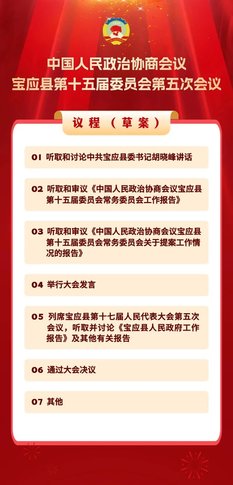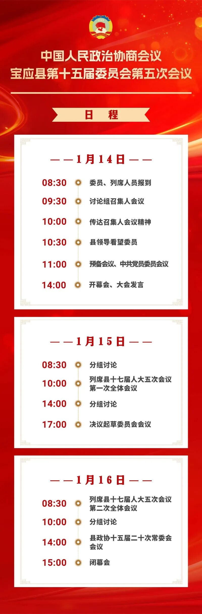 经县委同意,县政协十五届十九次常委会会议审议通过,政协宝应县第十五届委员会第五次会议于2026年1月14日至16日在县城举行,会期三天。