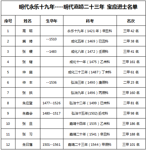从唐高祖武德五年(622年)科举制度的正式实行,到明代永乐十八年(1420年),近800年间因史书缺失,唐、宋、元三代宝应是否有士子高中进士?资料阙如。