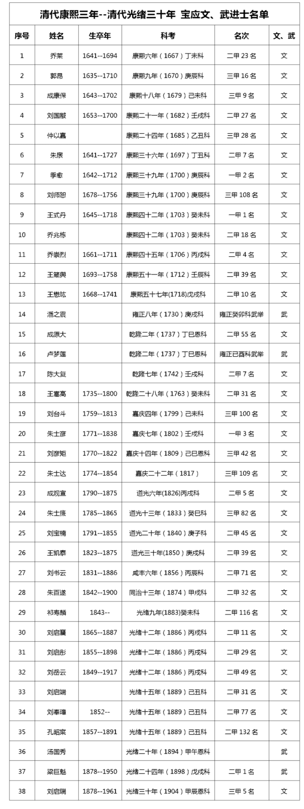 从清代康熙三年(1664年)甲辰科经雍正朝、乾隆朝、嘉庆朝、道光朝、咸丰朝、同治朝至光绪朝三十年(1904年)甲辰恩科最后一次科举考试,历时241年。宝应籍举人历朝科举均有斩获,分别高中文科进士34人、武科进士4人。清代康熙朝至光绪朝宝应进士名单附表如下: